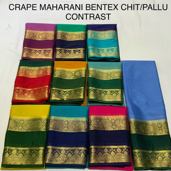 Step into royal elegance with the Crêpe Maharani Bentex Chit/Pallu Contrast Saree, crafted from premium crêpe fabric for a lightweight, soft, and flowing drape. The saree features an intricate chit (body) design combined with a striking contrast pallu, offering a perfect blend of traditional charm and modern sophistication.