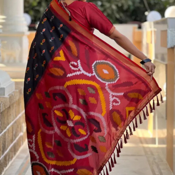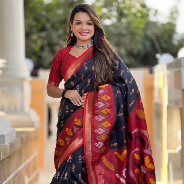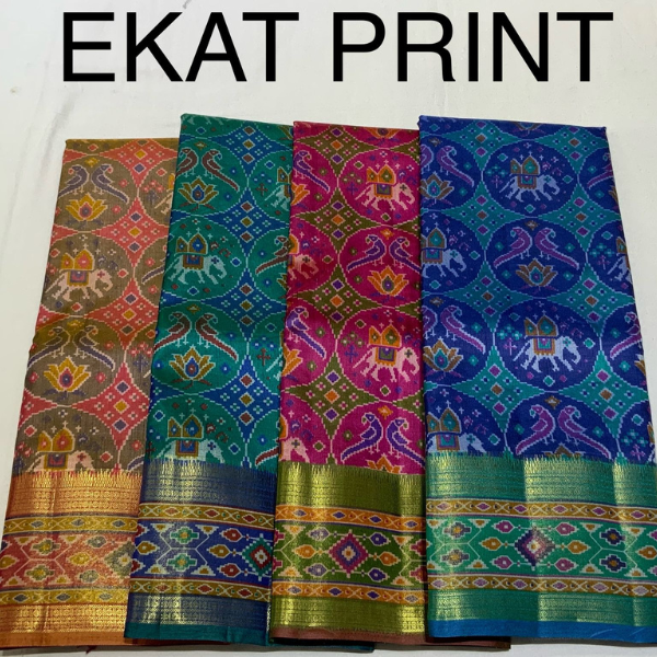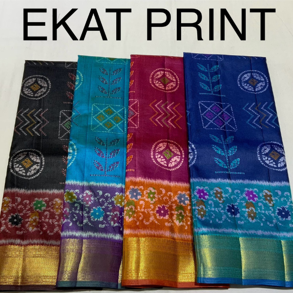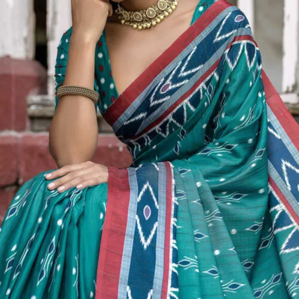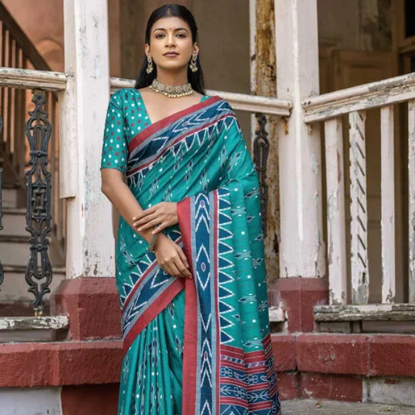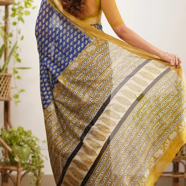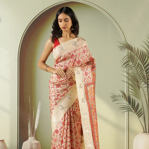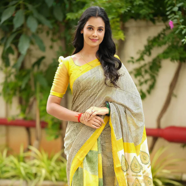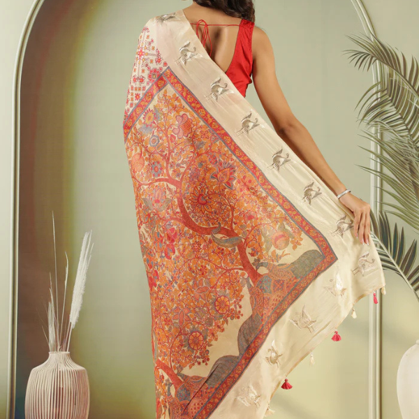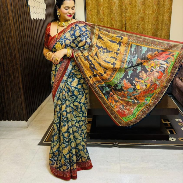 This gorgeous Kalamkari printed Kraft Kalamkari Saree comes with an unstitched blouse. The pallu of the saree with beautiful Kerala Mural Art Form Inspired print adds to the beauty of this concept. This saree is trendy yet a classic addition to your wardrobe.