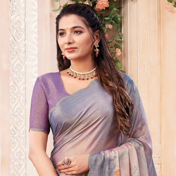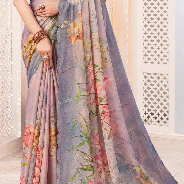 Greyish Purple Digital Print Chiffon Saree With Cut Work Border