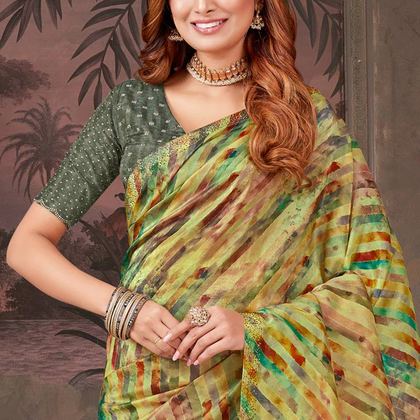 Pale Olive Green Designer Fancy Chiffon Digital Print Saree With Diamond Work