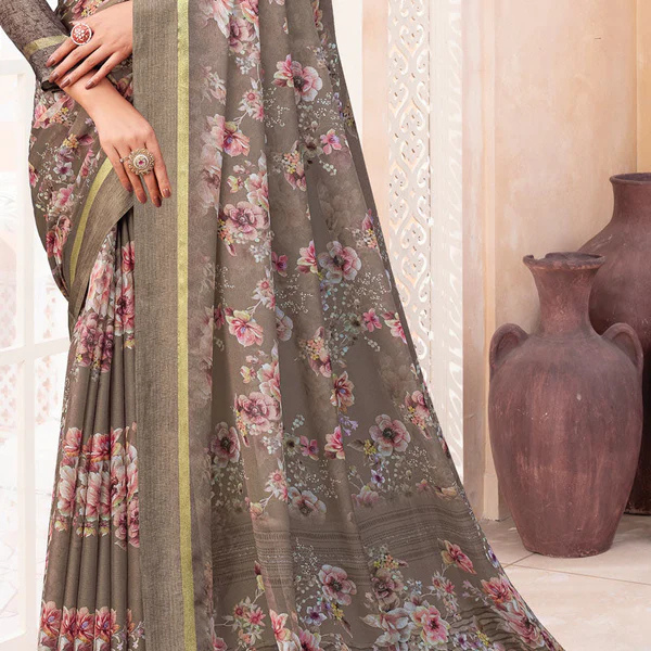 Pale Tobacco Brown Digital Print Chiffon Saree With Weaved Satin Patta And Tassel
