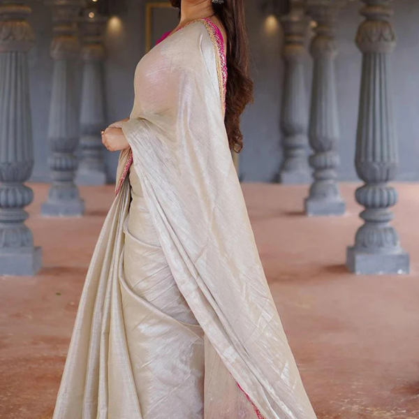 Pastel Grey colored saree is made from jimmy choo tissue fabric which is highlighted with ombre print and sequins work on border as shown. Comes along with unstitched banglori silk blouse piece which you can customize as per your design/style. Occasion – You can wear this saree for festive and party.