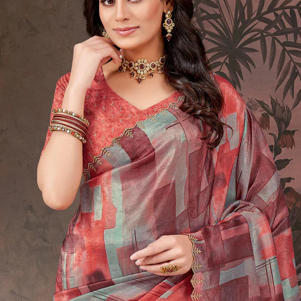 Purplish Brown And Pastel Red Designer Fancy Chiffon Digital Print Saree With Diamond Work And Cut Work Border