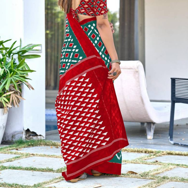 Teal mulcotton ikat print saree with unstitched blouse piece